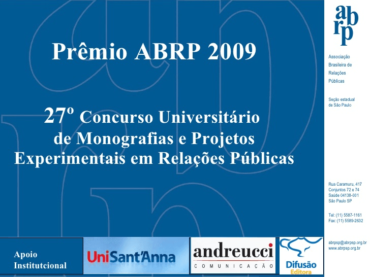 Hoje, dia 28 de Outubro, será realizada pela primeira vez na Uni Sant’Anna (campus Santana), às 19h30, no auditório I, no 6º andar do bloco I, a cerimônia do 27º Prêmio ABRP – Destacando Talentos de Relações Públicas.