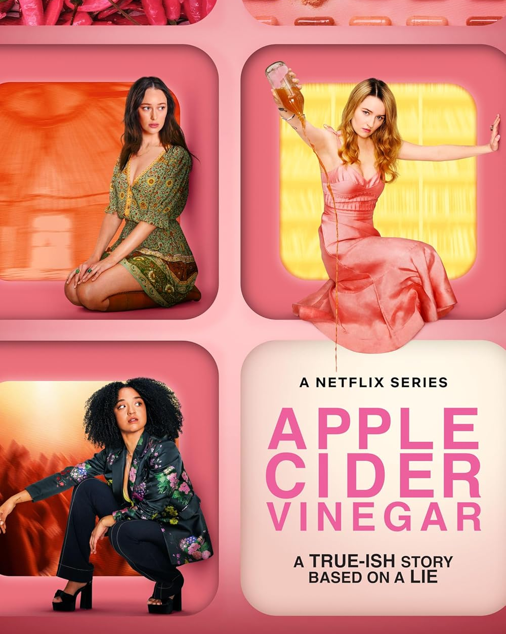 Baseada em uma história real, a série cria uma narrativa nova para abordar diferentes casos, daí a escolha do nome Vinagre de Maçã. A trama acompanha duas influenciadoras digitais que têm câncer. A carismática Belle Gibson constrói seu império no mundo do bem-estar, afirmando ter curado um câncer terminal por métodos alternativos. No entanto, sua verdade começa a ruir quando sua fraude é desmascarada. A outra influencer, Milla Blake, de fato tem câncer e busca uma cura alternativa, que acabou por lhe custar a vida aos 28 anos.