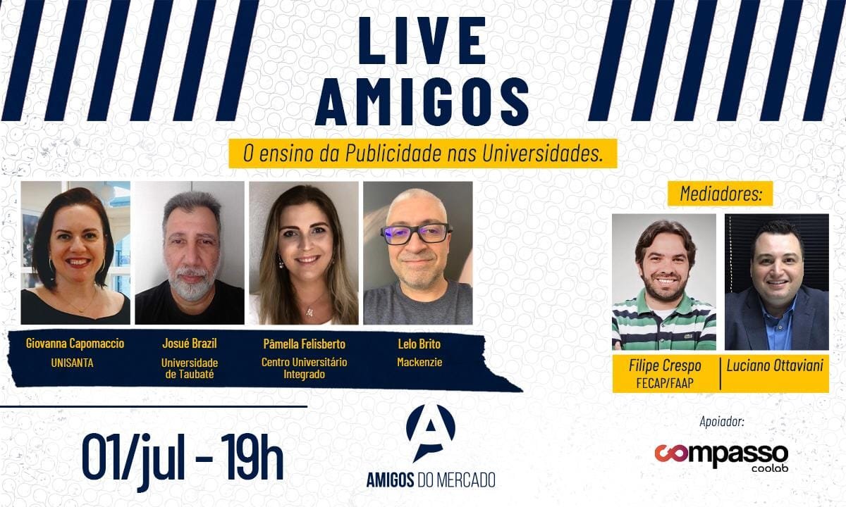 Nessa quinta-feira, 01 de julho, o Amigos de Mercado terá sua 47ª Live, onde o tema será “O Ensino da Publicidade nas Universidades”. Com o início das férias universitárias, o Amigos do Mercado irá promover, no mês de julho, algumas Lives temáticas relacionadas ao tema Educação.
