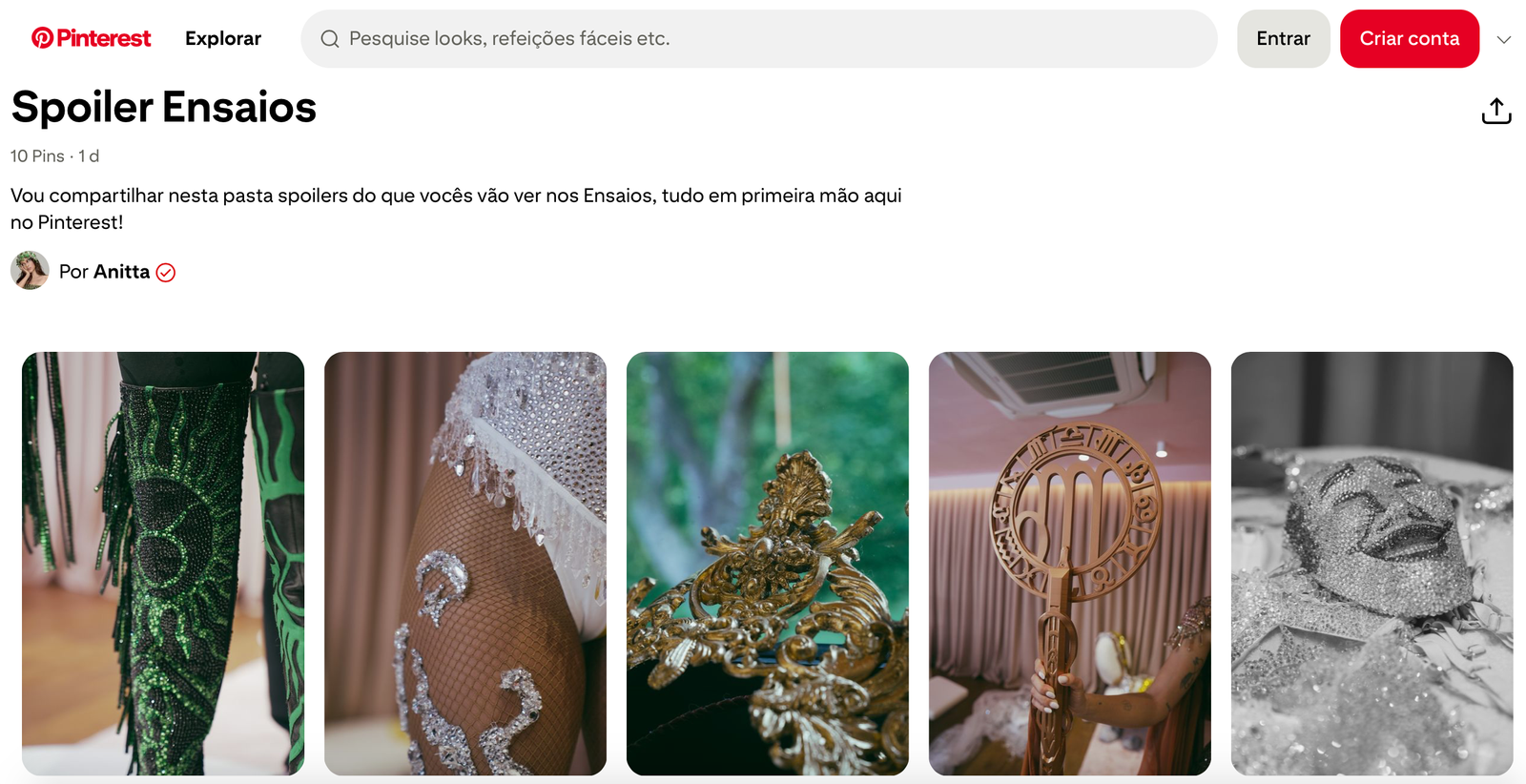 Além da pasta de spoilers, o perfil de Anitta no Pinterest conta com a pasta “Ensaios da Anitta 2026”, que traz looks completos, registros dos shows e bastidores, a pasta de “Manifesting 2026”, com desejos, referências e metas visuais para o ano e muito mais.