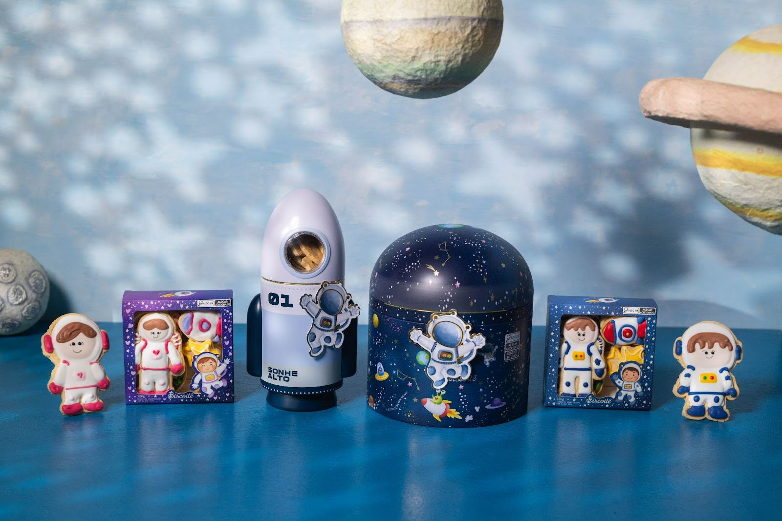 Entre os destaques está a Lata Luminária Astronauta (315g – R$ 169,90), que une biscoitos decorados e embalados individualmente a um presente que vai além do sabor: a embalagem se transforma em uma luminária divertida, perfeita para iluminar a imaginação. Já a Lata Foguete (100g – R$ 109,90) traz 16 unidades embaladas individualmente em um design lúdico que conquista crianças e adultos apaixonados pelo espaço.