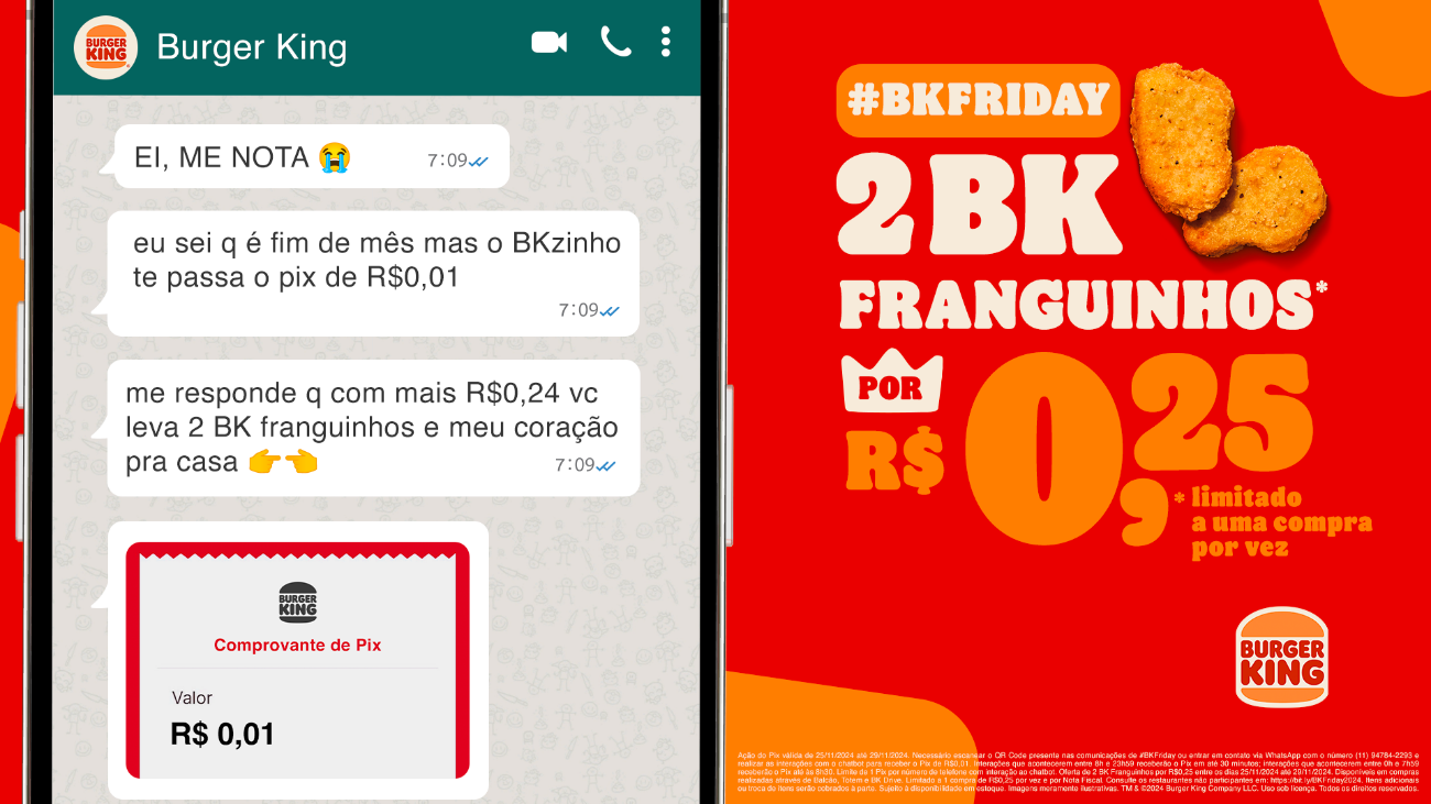 A rede de fast-food surpreende na divulgação de sua promoção de Black Friday: oferece 2 BK Franguinhos por apenas R$0,25 e envia Pix de R$0,01 para membros do Clube BK®