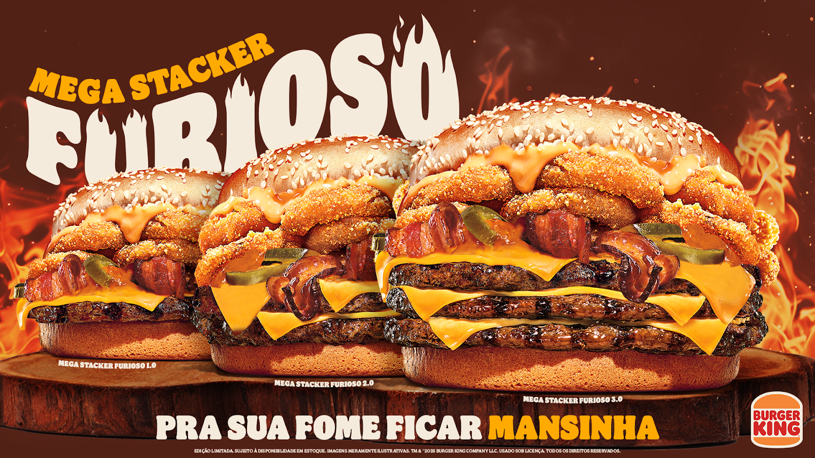 Edição limitada. Sujeito à disponibilidade em estoque. Imagens meramente ilustrativas. O uso do cupom “FURIOSO10” garante R$10,00 de desconto na combra dos Combos Mega Stacker Furioso 1.0, 2.0 e 3.0. do dia 08/10 a 26/10/25, válido para Balcão, Drive-thru e Totem. Confira lojas participantes em: https://bit.ly/3KHc9tI. TM & ©2025 Burger King Company LLC. Usado sob licença. Todos os direitos reservados.