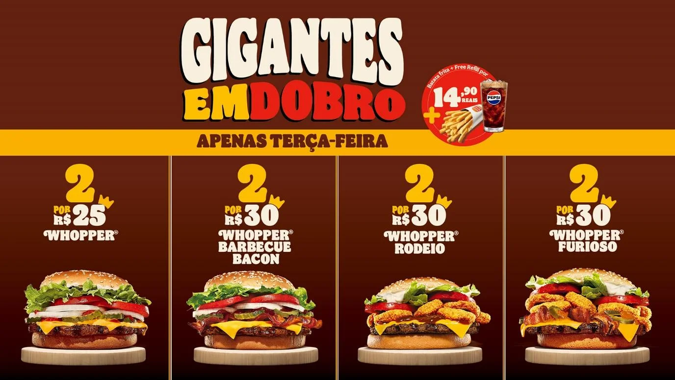 Os preços promocionais são válidos apenas nos dias 10/09, 17/09 e 24/09 ou enquanto durarem os estoques. O preço total de R$30 é válido na compra de dois sanduíches da linha Whopper® Especiais (Whopper® Barbecue Bacon, Whopper® Rodeio e Whopper® Furioso). Itens adicionais ou troca de itens serão cobrados à parte. Oferta válida no BK Drive, app do BK®, lojas físicas e no BK Delivery* (delivery próprio no app do BK). Consulte os restaurantes não participantes em https://bit.ly/GigantesEmDobroo (essa lista não se aplica ao BK Delivery).