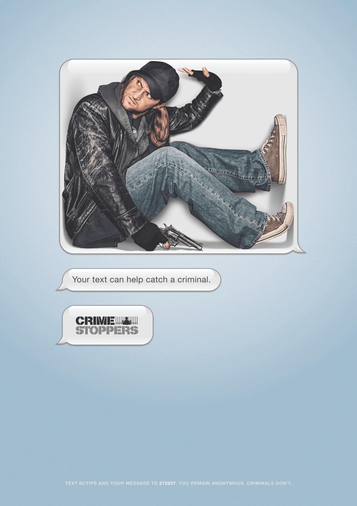 A Organização de Crimes e Denúncias do Canadá – Crime Stoppers lançou uma campanha com o objetivo de incentivar o uso do celular para denunciar crimes. Com veiculações em mídia impressas e vídeo, a campanha criada pela DDB Canadá “prende” ladrões em mensagens de texto. Veja o vídeo e as peças:
