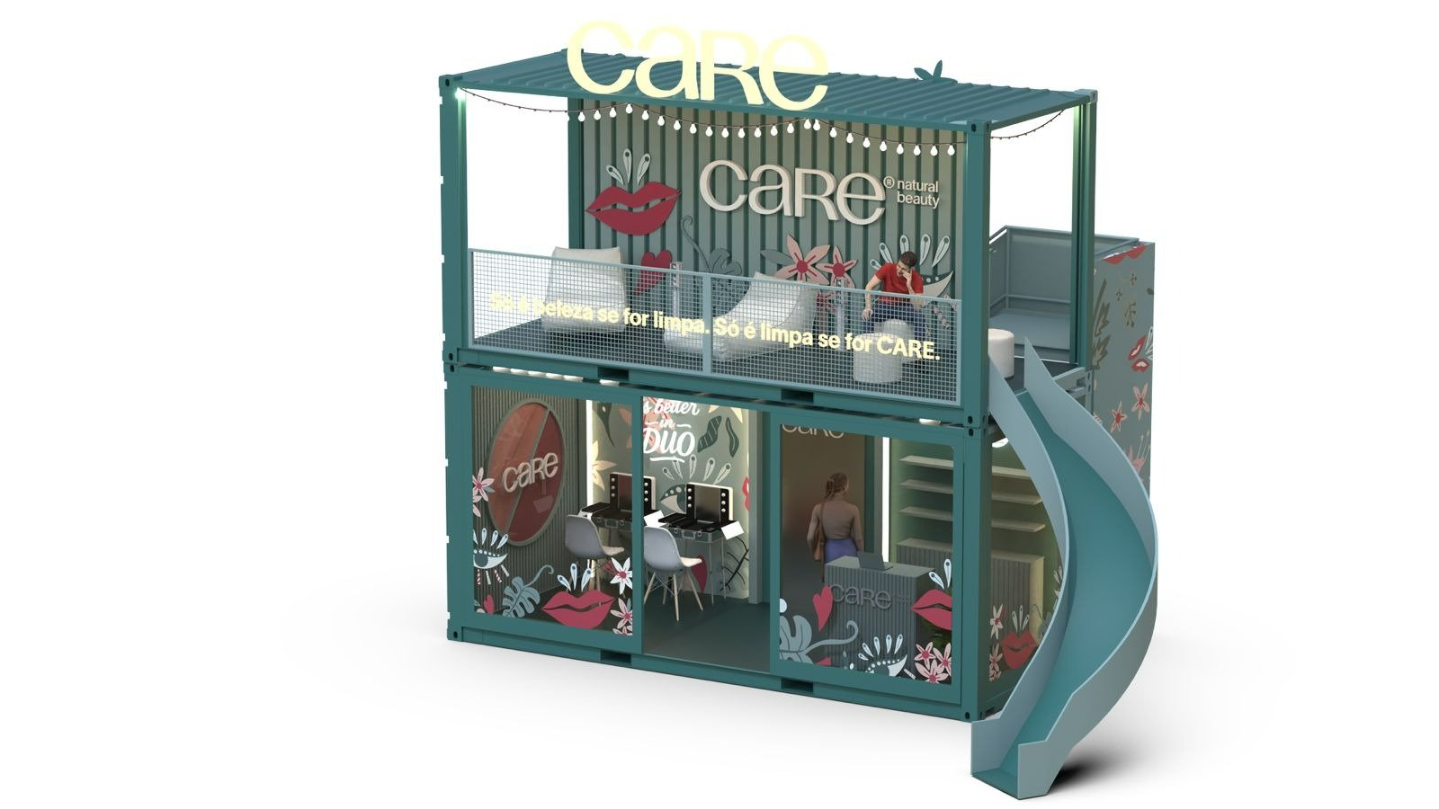 Instalado em um contêiner de dois andares, o ambiente foi pensado para equilibrar beleza e bem-estar. No piso térreo, o público pode retocar a maquiagem, experimentar e comprar produtos da CARE em um clima leve e descontraído. Já no andar de cima, o convite é para relaxar, recarregar o celular e as energias em um momento de descanso. A ativação ainda conta com um escorregador, que reforça o espírito divertido e acolhedor do espaço.
