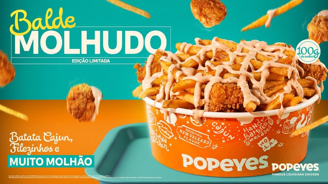 O Popeyes, uma das maiores redes de frango frito do Brasil, apresenta uma nova experiência indulgente com o lançamento do Balde Molhudo. A partir do dia 22 de julho, os consumidores poderão saborear o novo produto, que traz filezinhos de frango, uma generosa porção de batata Cajun, intercalados com muito molho a sua escolha — Nola Rose, Louisiana Maionese Temperada ou Barbecue — em sua versão com ou sem cebola crispy.