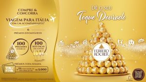 Ferrero Rocher apresenta, pelo terceiro ano consecutivo, a Promoção “Dê Seu Toque Dourado”. Desde o dia 03 de novembro, os consumidores podem concorrer a prêmios que unem elegância e celebração. Para esse ano a marca traz ao consumidor ainda mais possibilidades de prêmios, serão sorteadas 100 pirâmides icônicas de Ferrero Rocher (com 96 bombons cada),100 kits de taças exclusivas (da marca italiana Luigi Bormioli) e seis vouchers de R$ 5.000,00 em produtos da Tok&Stok. O grande prêmio final será uma viagem para a Itália com acompanhante¹.