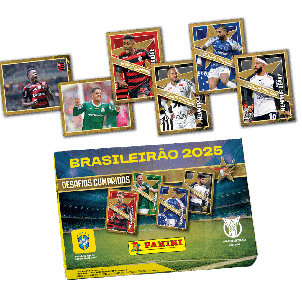 Finalizando essa edição histórica do campeonato brasileiro, a Panini também está lançando o Box com os jogadores que atingiram os desafios propostos no álbum do Brasileirão 2025. A coleção inclui 44 figurinhas dos jogadores e 6 cromos especiais de comemorações de gols dos cinco times melhores colocados no campeonato.