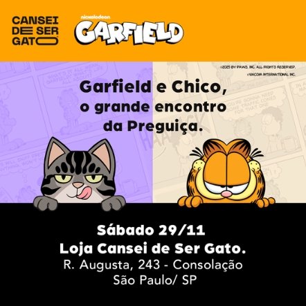 Garfield, um dos gatos mais queridos e preguiçosos do mundo, vai sair do sofá para celebrar seu mês favorito em grande estilo. Em parceria com o Cansei de Ser Gato, uma das maiores comunidades felinas do país, os personagens Garfield e Chico promovem uma ação divertida e cheia de mimos para fãs e tutores de gatos.