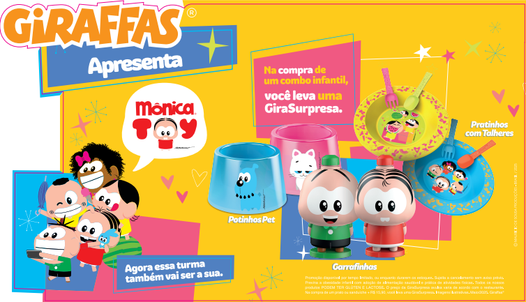 “Essa campanha celebra o universo lúdico da Turma da Mônica e reforça nosso compromisso em criar experiências que envolvam toda a família — agora também com espaço para os pets. Os brindes foram pensados com carinho para oferecer momentos de afeto, diversão e conexão entre gerações”, destaca Luciana Morais, Diretora de Marketing e Trade do Giraffas.