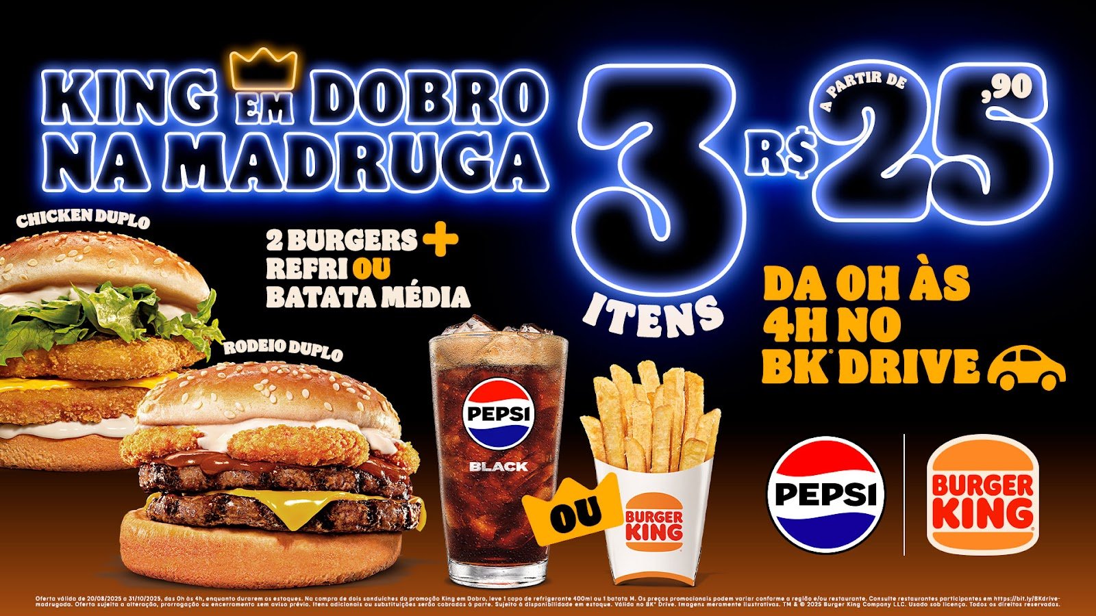 Oferta válida de 20/08/2025 a 31/10/2025, das 0h às 4h, enquanto durarem os estoques. Na compra de dois sanduíches da promoção King em Dobro, leve 1 copo de refrigerante 400ml ou 1 batata M.