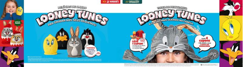 O Dia das Crianças é uma das datas mais importantes para o Grupo Habib’s e, por isso, as marcas Habib’s e Ragazzo pensaram em experiências e surpresas exclusivas que vão fazer essa data ainda mais especial para todas as famílias. Em parceria com a Warner Bros. as marcas lançaram, no dia 26 de setembro, uma coleção exclusiva que vai conquistar crianças e despertar a nostalgia dos adultos. Os personagens icônicos Looney Tunes: Pernalonga, Patolino, Piu-Piu, Frajola, Taz e Lola chegam às lojas cheios de diversão, nostalgia e carisma para transformar a hora da refeição em uma experiência ainda mais inesquecível.