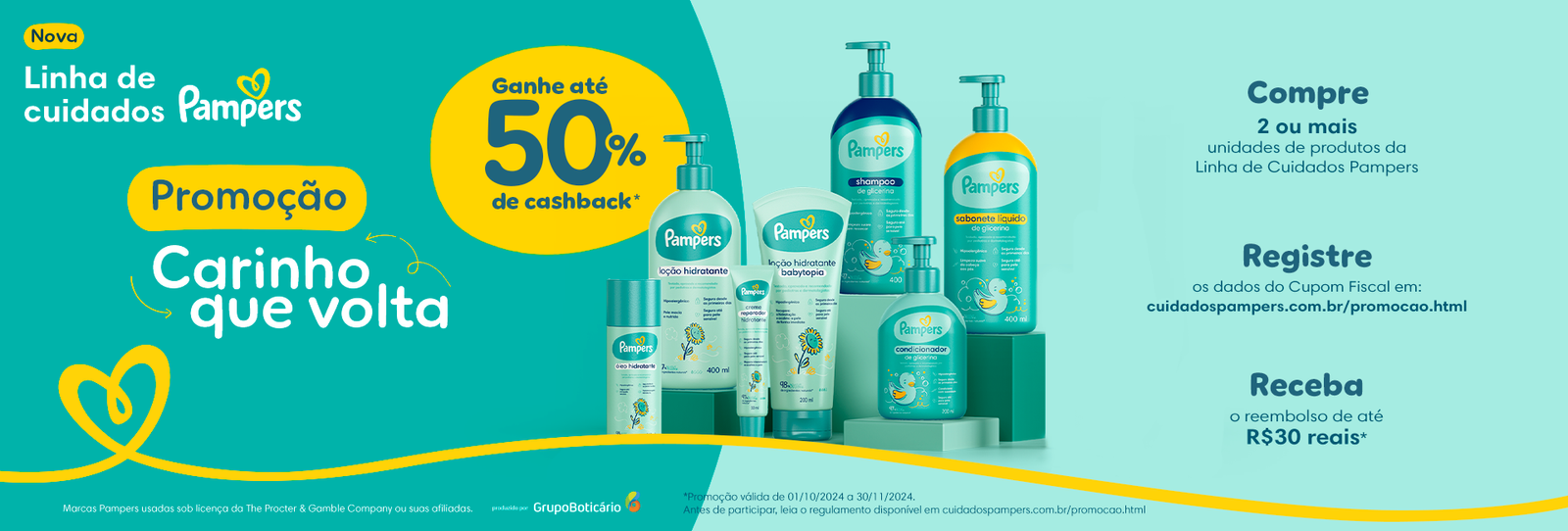 Válida para pessoa física com CPF, maior de 18 anos, titular de uma conta ativa no PicPay, que de 01/10/24 a 30/11/24 efetuar a compra mínima, em um mesmo cupom fiscal, de 2 produtos da Linha de Cuidados Pampers* Corpo e Banho em qualquer estabelecimento nacional e solicitar no site o reembolso de 50% do valor, limitado a R$30 por CPF durante toda a Ação e condicionado à validação do cupom fiscal. O montante total da Ação é de R$ 443.800 em reembolso, sendo encerrada de imediato caso se atinja este valor. Antes de participar, leia o regulamento completo.