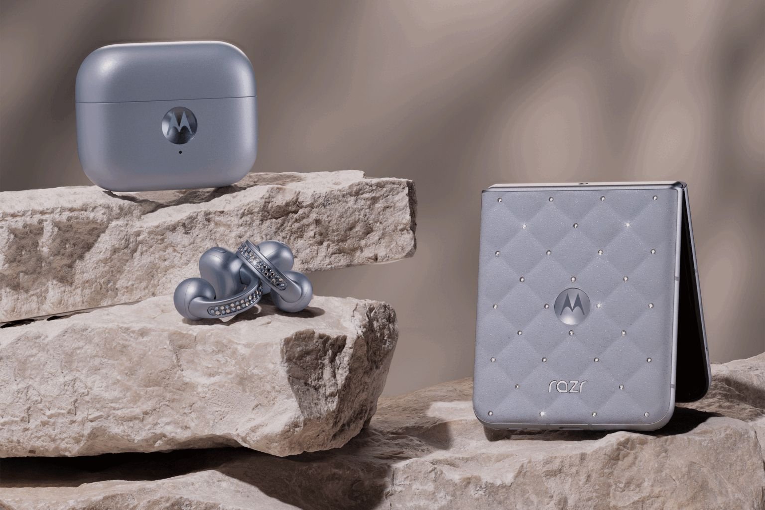 A novidade traz o smartphone dobrável Razr 60 e os fones Moto Buds Loop, ambos na cor Pantone Ice Melt e cravejados com cristais Swarovski.