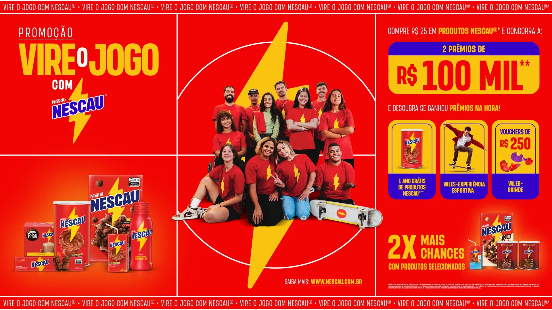Mecânica da promoção – Os consumidores que adquirirem R$ 25 em produtos NESCAU® participantes e cadastrarem o cupom fiscal no site da promoção (https://www.nescau.com.br/promo) podem concorrer a dois sorteios no valor de R$ 100 mil. Além disso, após o cadastro o consumidor recebe na hora um card virtual de um embaixador NESCAU® e descobre se ganhou algum prêmio na hora: um ano de produtos da marca, experiências esportivas na plataforma Viva Experiências, no valor de R$ 250, ou um voucher virtual de lojas de artigos esportivos. A promoção é válida até 31 de maio.
