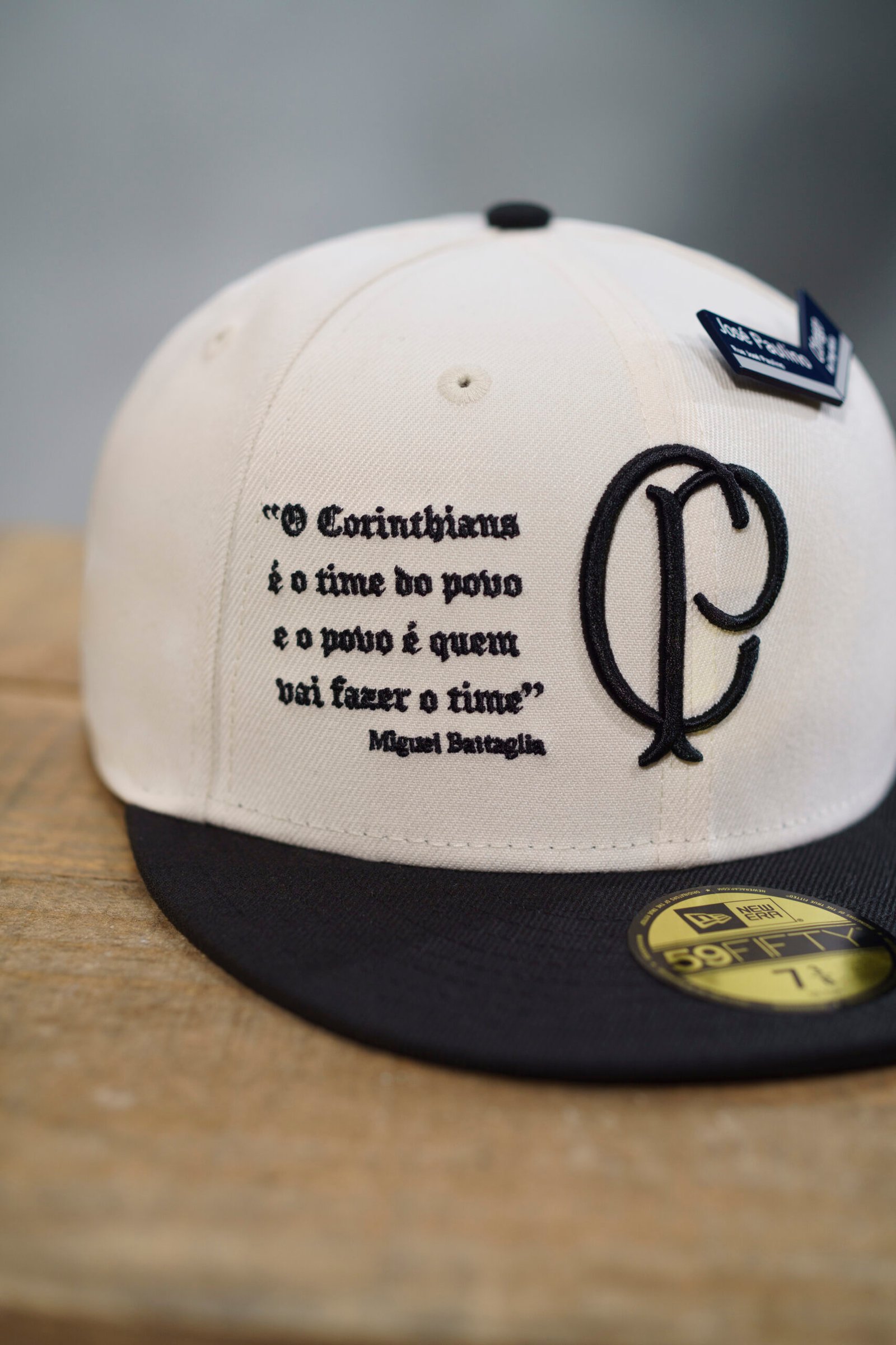 - 59FIFTY em off-white com aba preta: traz como elementos centrais a célebre frase de Miguel Battaglia: “O Corinthians é o time do povo e o povo é quem vai fazer o time.” em tipografia gótica, o logo histórico “CP” em bordado alto relevo e um pin metálico removível com referência à esquina das ruas José Paulino e Cônego Martins, local ligado à fundação do clube no bairro do Bom Retiro. O painel traseiro contém o bordado “SCCP 1910” e na parte interna a frase “sob a luz de um lampião”, também relacionado ao momento que o time foi fundado.