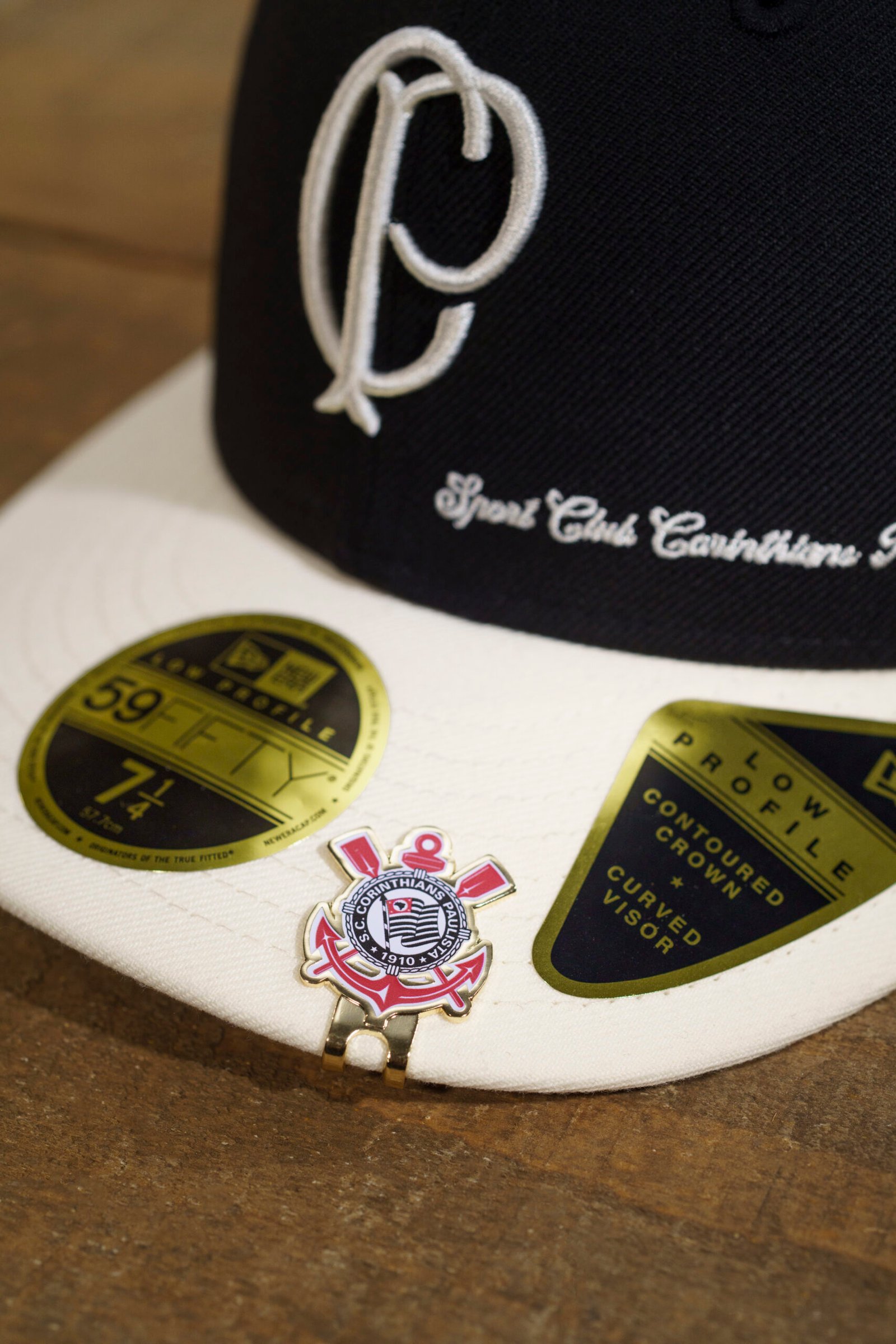 - 59FIFTY Low Profile em preto com aba off-white: a versão com coroa mais baixa e aba levemente pré-curvada traz o escudo histórico “CP” acompanhado do bordado “Sport Club Corinthians Paulista” deslocado no painel frontal. A aba conta com um cap clip (similar a um pin, porém específico para encaixe na aba) metálico removível com o brasão oficial do clube — um detalhe colecionável que reforça o caráter premium da peça. No painel traseiro, data e hora de fundação do clube: “1 de setembro de 1910” e “20h30” em tipografia gótica.