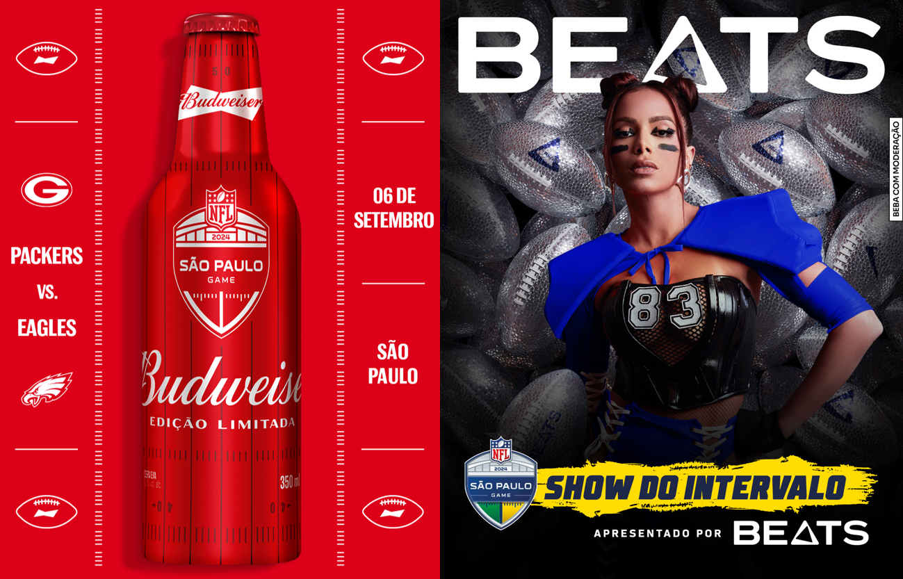 Bud trouxe ídolo do football para o país, lançou garrafa comemorativa e convida fãs para testarem habilidades de chute na NFL Experience. Beats tem promoção para agitar o esquenta para o show do intervalo com Anitta