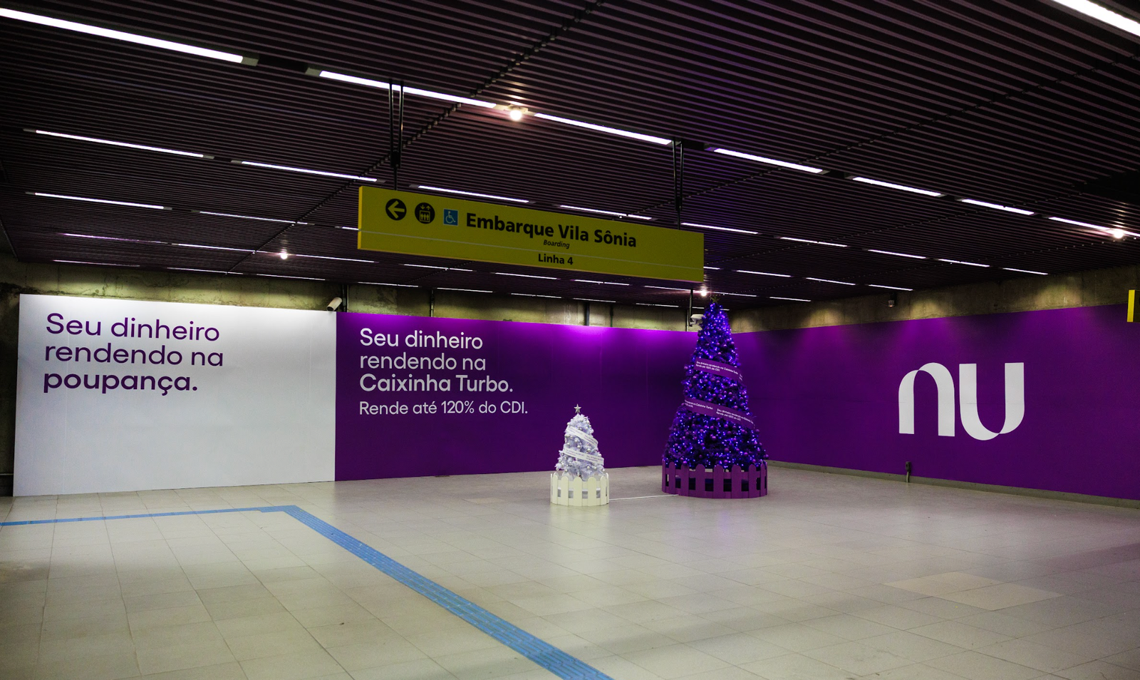 Idealizada pela Wieden+Kennedy SP, a ação acontece nas cidades de São Paulo, Rio de Janeiro, Belo Horizonte, Salvador, Recife, Porto Alegre e Curitiba em locais estratégicos do ponto de vista de alcance, visibilidade e retenção da atenção das pessoas. Na capital paulista, por exemplo, uma instalação com dois tamanhos de árvores de Natal na estação Pinheiros ilustra os benefícios da Caixinha Turbo do Nubank, que pode render até 120% do CDI. Em outros pontos da estação, como em telas dentro dos vagões, a mensagem é reforçada. Já na estação Consolação do metrô, os comparativos sobre o quanto o dinheiro rende em cada modalidade são ilustrados em uma escada rolante e em uma escada fixa.