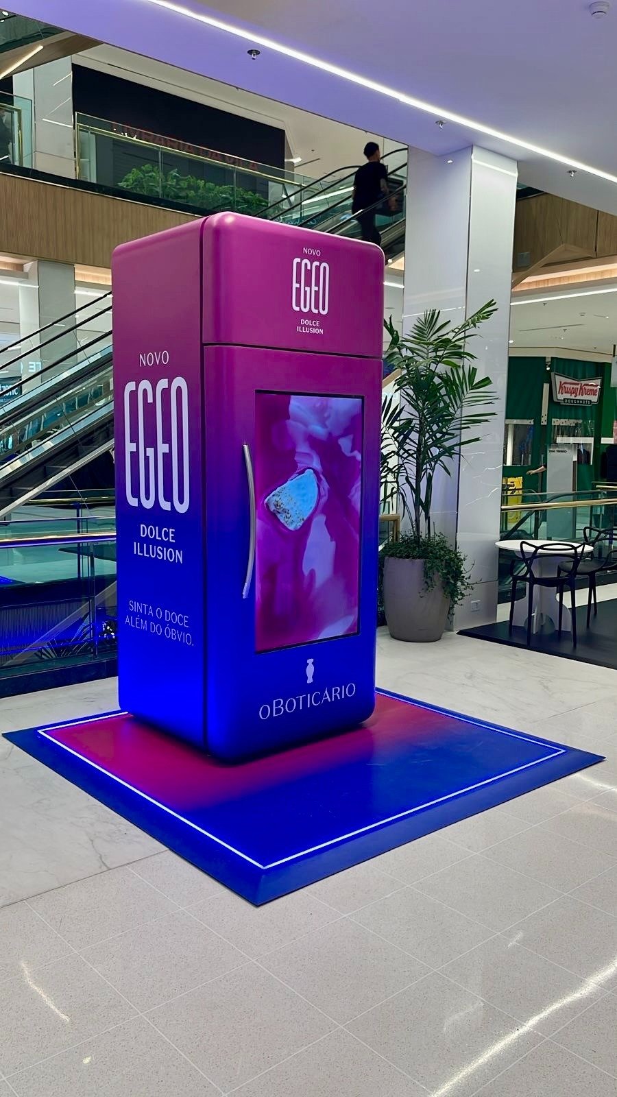 Instalada no centro comercial entre os dias 09 e 16 de janeiro, a ativação foi pensada para despertar curiosidade e provocar interação com os consumidores lovers de Egeo. A geladeira surge como metáfora visual para o contraste sensorial do universo de Egeo Dolce Illusion, um gourmand que brinca com percepções, nova forma de sentir e explorar o uso da fragrância fora do óbvio, que pode aderir a um sensorial mais gelado, especialmente na temporada quente do verão, quando apresentamos a novidade.