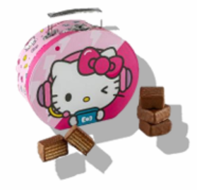 Maleta Hello Kitty, com wafer de chocolate recheado com creme de avelã e coberto com chocolate ao leite 100% de origem.