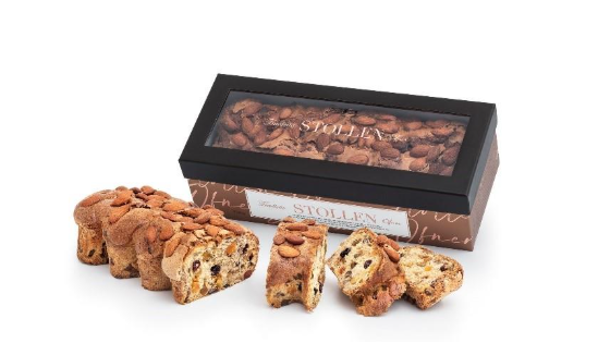 Bolo artesanal, receita tradicional alemã feita com massa de tripla fermentação 100% natural e uma mistura rica de frutas cristalizadas, amêndoas, nozes e uvas-passas, finalizado com uma cobertura doce de castanha-de-caju e amêndoas.