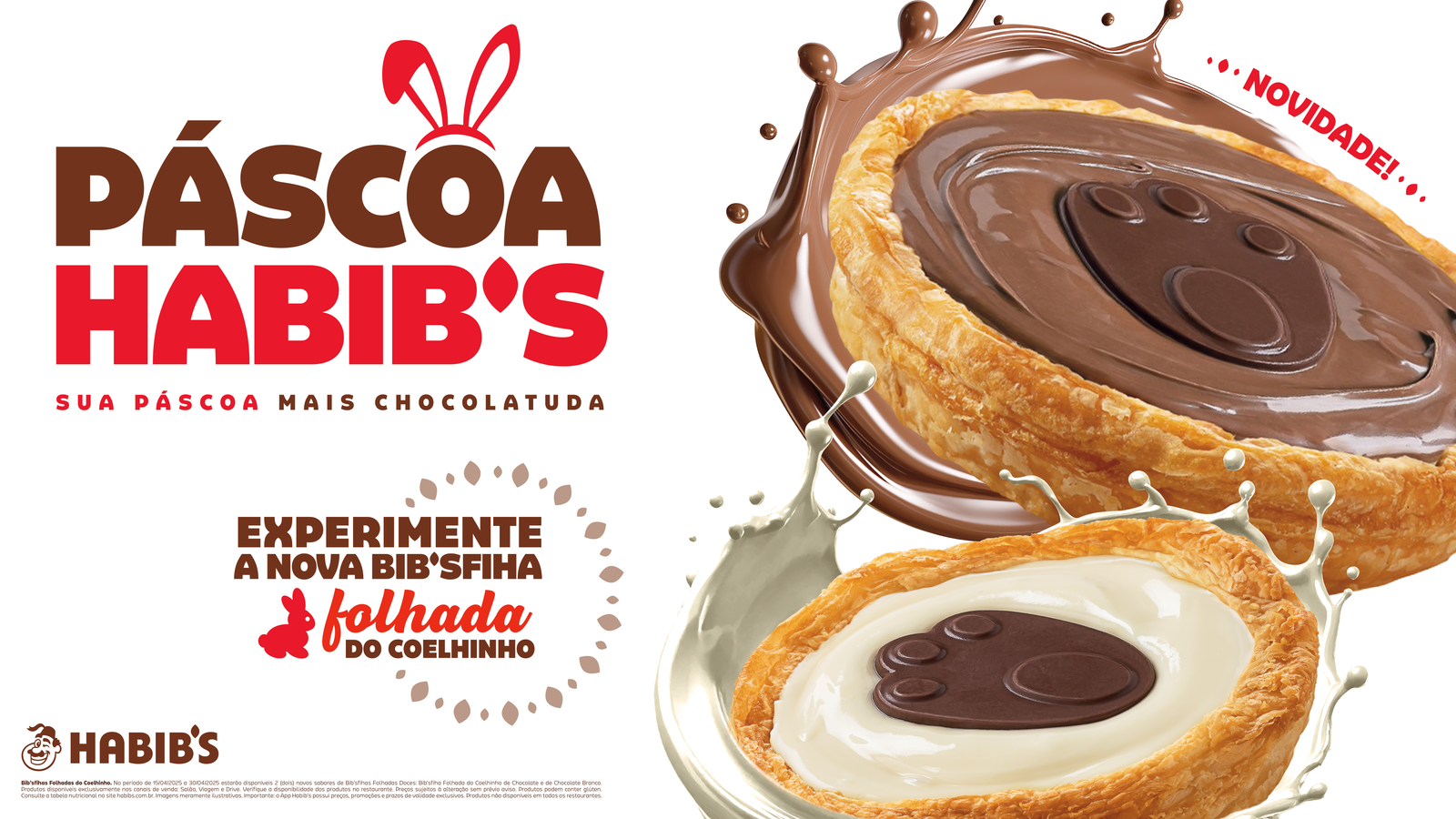 Para deixar a Páscoa ainda mais saborosa, o Habib’s preparou um cardápio especial. Entre os lançamentos, duas Bib’sfihas folhadas com recheios de chocolate branco e ao leite, ambas decoradas com patinhas de coelho artesanais, a partir de R$ 9,90.