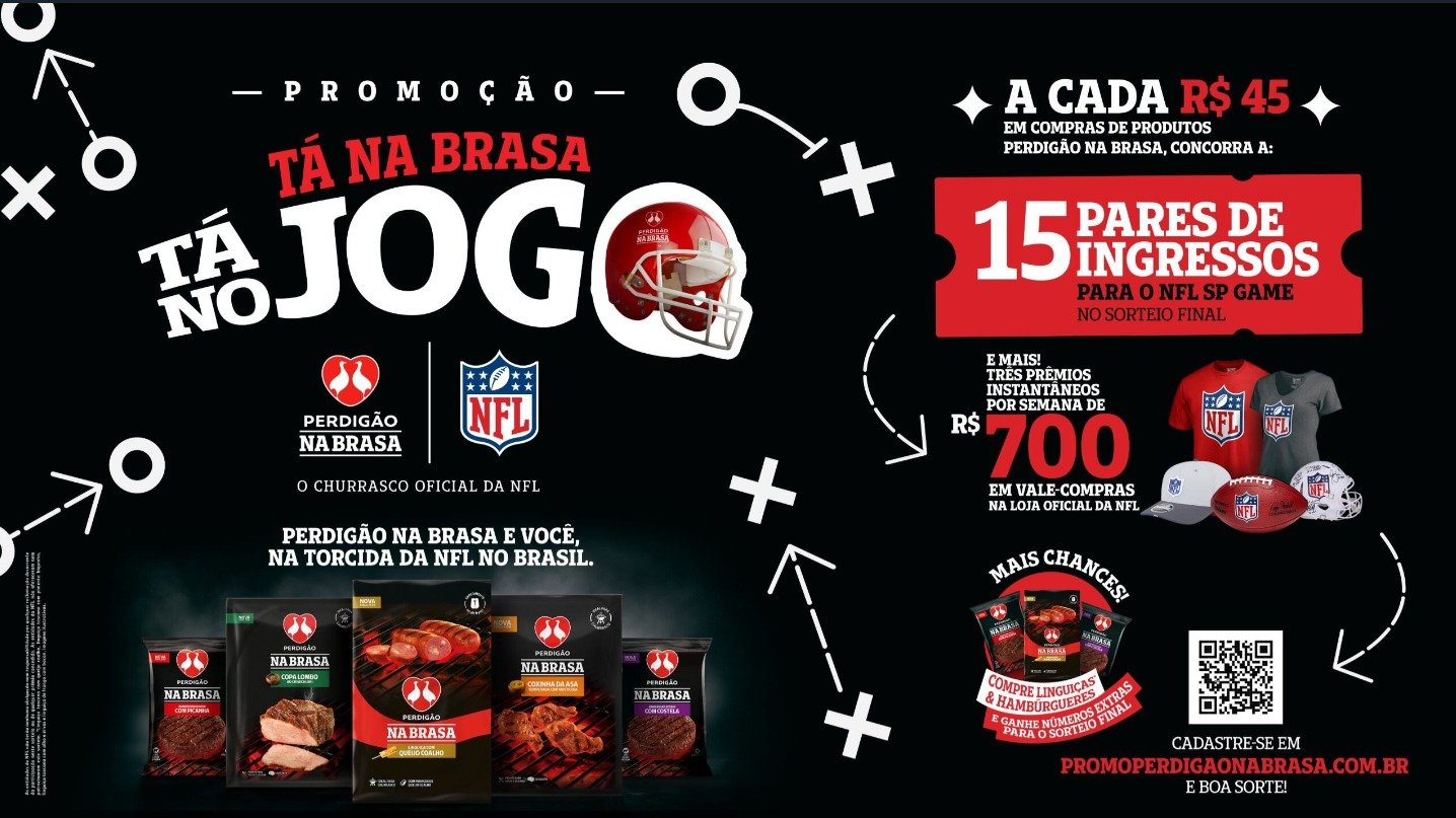 Pelo segundo ano como o churrasco oficial da NFL, Perdigão Na Brasa fortalece sua relação com os consumidores e fãs da liga com uma ação inédita, a promoção: Tá na Brasa, Tá no Jogo. Realizada entre os dias 2 e 21 de agosto, com abrangência nacional, a iniciativa sorteará 15 pares de ingressos para a partida do Los Angeles Chargers vs. Kansas City Chiefs, agendada para 5 de setembro, em São Paulo, além de distribuir três prêmios instantâneos semanais de R$700 em vale-compras na loja online oficial da NFL.