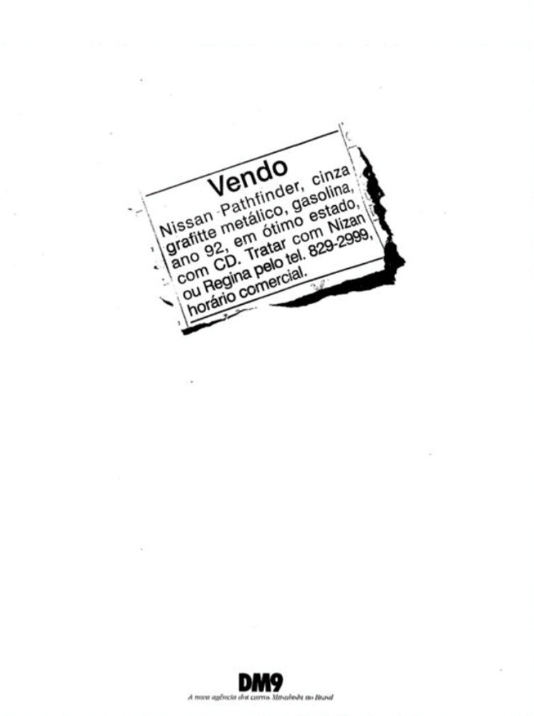 “Vendo Nissan Pathfinder, cinza grafite, metálico, gasolina, ano 92, em ótimo estado, com CD. Tratar com Nizan ou Regina pelo tel. 829-2999.”