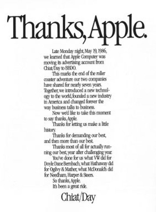 O segundo anúncio é de perda, mas ele é tão brilhante quanto o da DM9. A Chiat/Day foi a agência da Apple por muito tempo, desde o início da empresa, passando por grandes anúncios — entre eles, o clássico “1984”. Após uma mudança no marketing, com a chegada de um novo executivo, eles acabaram perdendo a conta e publicaram no Advertising Age este clássico.
