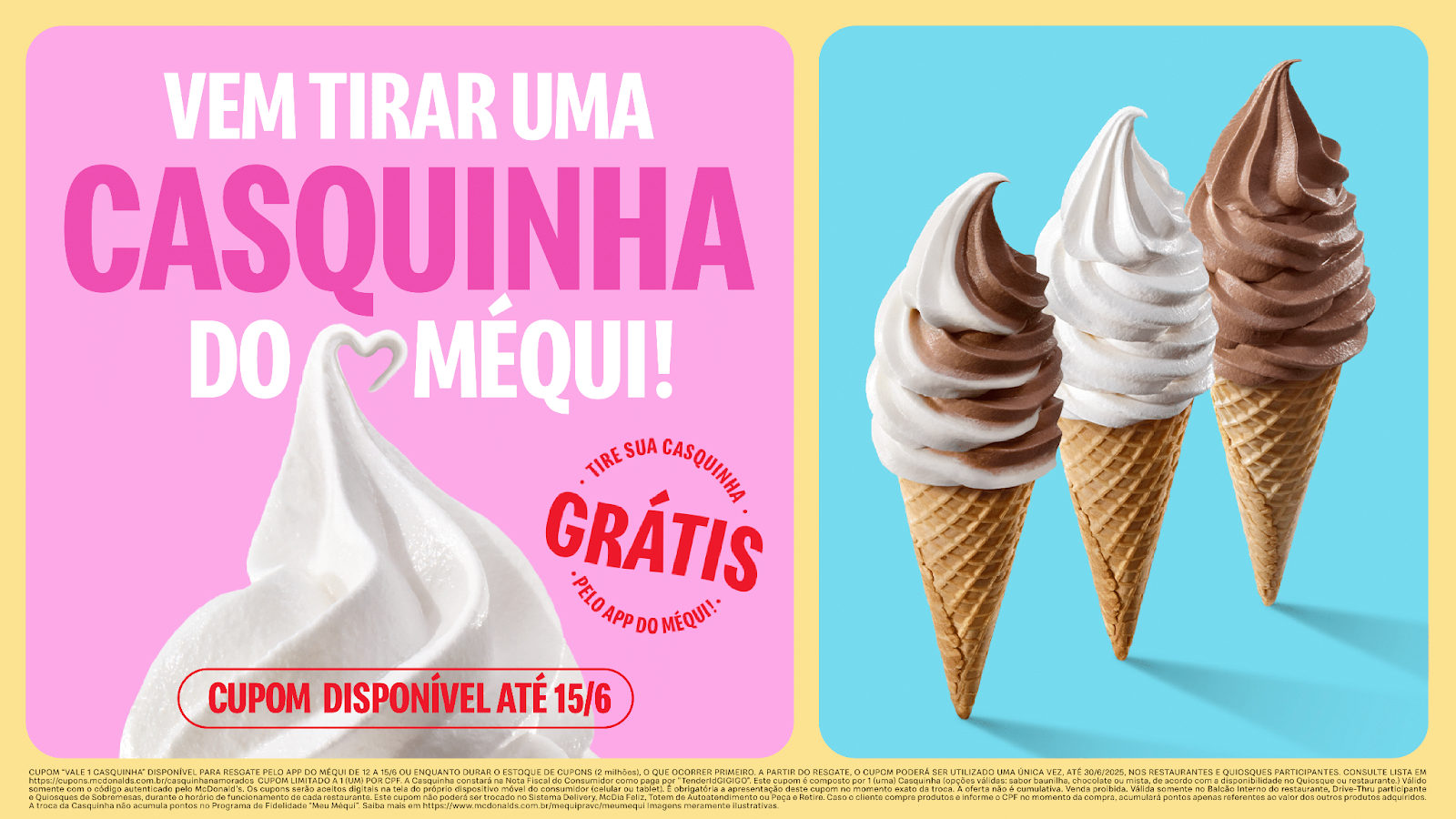 Para garantir a sua, o cliente deve resgatar o cupom de Casquinha Grátis no app da marca entre os dias 12 e 15 de junho – limitado a um cupom por CPF. Uma vez resgatado, o cupom pode ser utilizado até 30 de junho no Drive-Thru, balcão ou nos quiosques de sobremesa do McDonald’s (confira os restaurantes participantes clicando aqui).