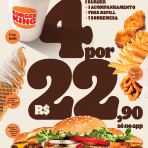 Cupom disponível no app do BK permite uma grande possibilidade de combinações de burgers, acompanhamentos, Free Refill e sobremesas no precinho Rebatendo os concorrentes, o