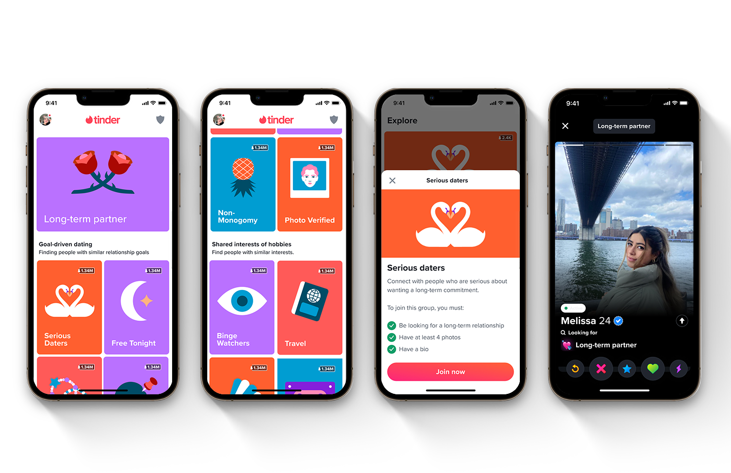 O bloco Relacionamento sério foi criado para aqueles que buscam algo a longo prazo, tornando mais fácil conectar-se com pessoas que compartilham o mesmo objetivo. Para acessar esse bloco, os usuários devem ter uma bio preenchida, pelo menos quatro fotos e definir seus objetivos de relacionamento como uma das opções de parceria de longo prazo. De acordo com uma pesquisa recente do Tinder, 69% dos solteiros estão em busca de algo sério, tornando o bloco “Apenas algosério” uma escolha popular. Além disso, muitos relataram estar procurando alguém para casar (41%), um relacionamento de longo prazo (39%) ou um compromisso real (27%).